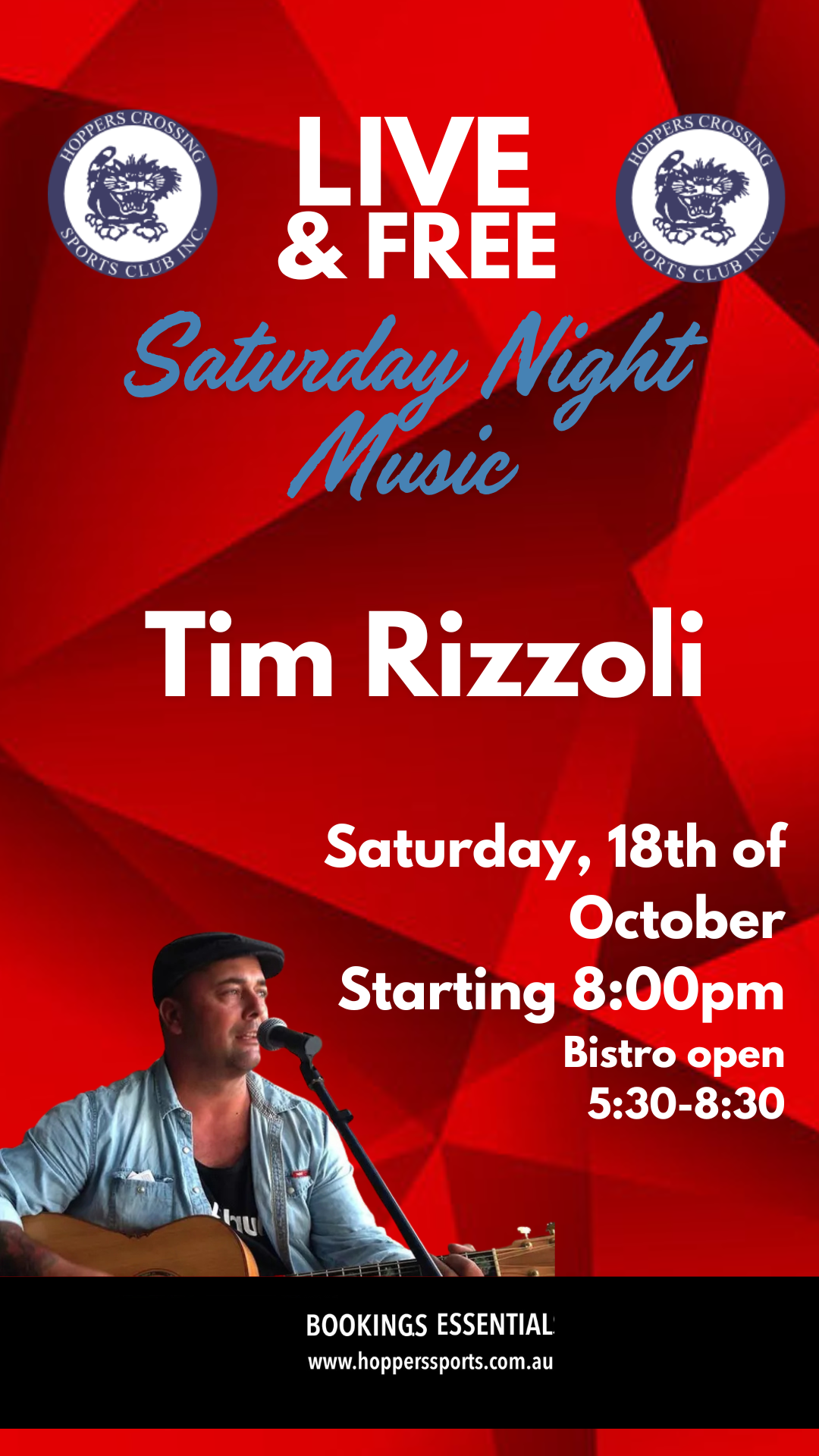 Come along and enjoy some free live music from the renowned crowd favourite Tim Rizzoli. Saturday 18th October. We recommend you book your table for a meal beforehad to guarantee a good spot!